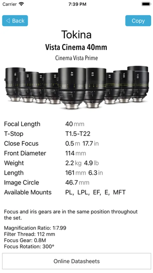 Focal Length, T-Stop, Close Focus, Weight, Length, Horizontal and Vertical Angle of View, Anamorphic Squeeze, Front Diameter, Number of Elements, Gearing, Number of Iris Blades, Magnification Ratio, Filter Size, Image Circle, Entrance Pupil, Lens Mount, Lens Data System Info.