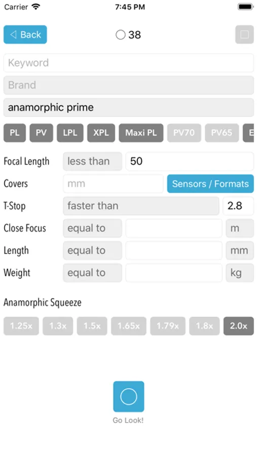 - SEARCH the database by Manufacturer, Keyword, Focal Length, T-Stop, Close Focus, Weight, Length, Horizontal and Vertical Angle of View, Anamorphic Squeeze