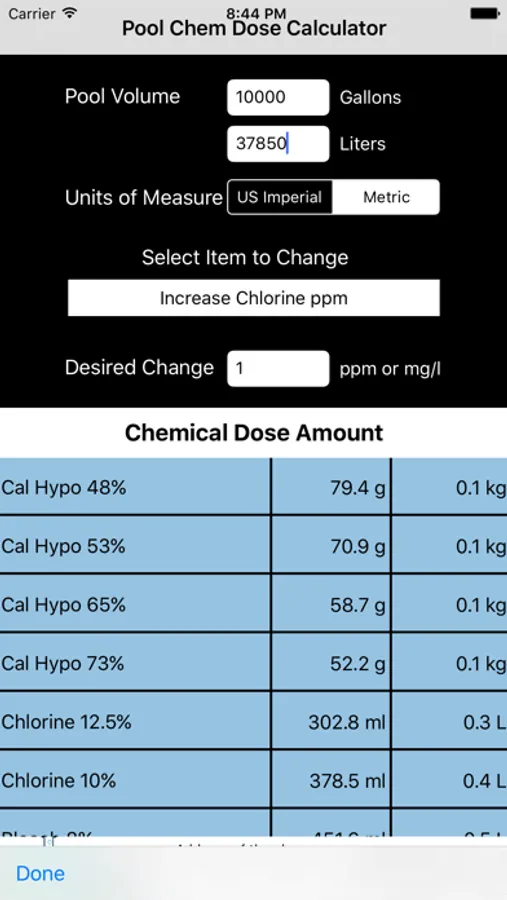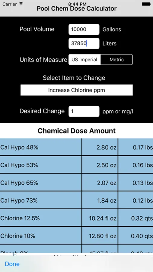 For example, if you want to Increase Chlorine by 3 ppm in a 14,750 gallon pool, enter 14750, select US Imperial, select Increase Chlorine from the drop down menu and enter 3.0 in ppm. Instantly see the amounts needed to get 3.0 ppm chlorine in that pool for 15 types of chlorine. Makes it easy to compare and see which might be cheaper to use or make a substitution.