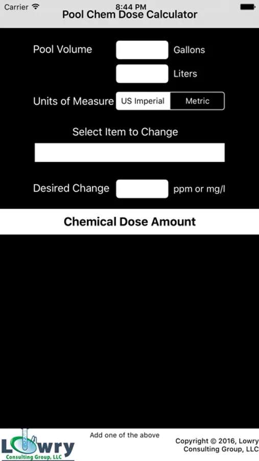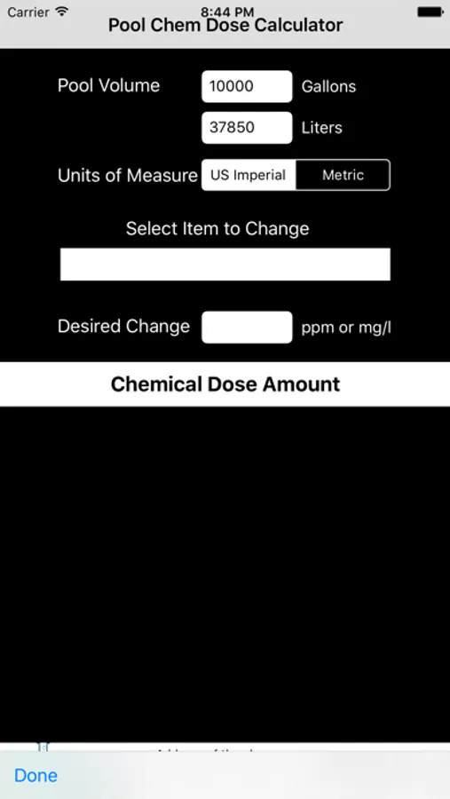 Pool Chem Dose Calculator will calculate the exact chemical dose needed for 38 chemicals in 11 categories for any size pool in US Imperial or Metric measures. To use it you enter the pool volume in gallons or liters, choose US Imperial or Metric, select which item you want to change from the drop down list and then enter the desired change in ppm or mg/l. Pool Chem Dose Calculator then lists all of the chemicals that can be used for that item change and the doses for each one. It only shows 3 chemicals on the screen. If there are more than 3 for an item, you can scroll down the list.