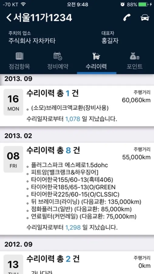 - 주정비업소에서 수리받으신 수리내용을 일자별, 주행거리별로 확인이 가능합니다.