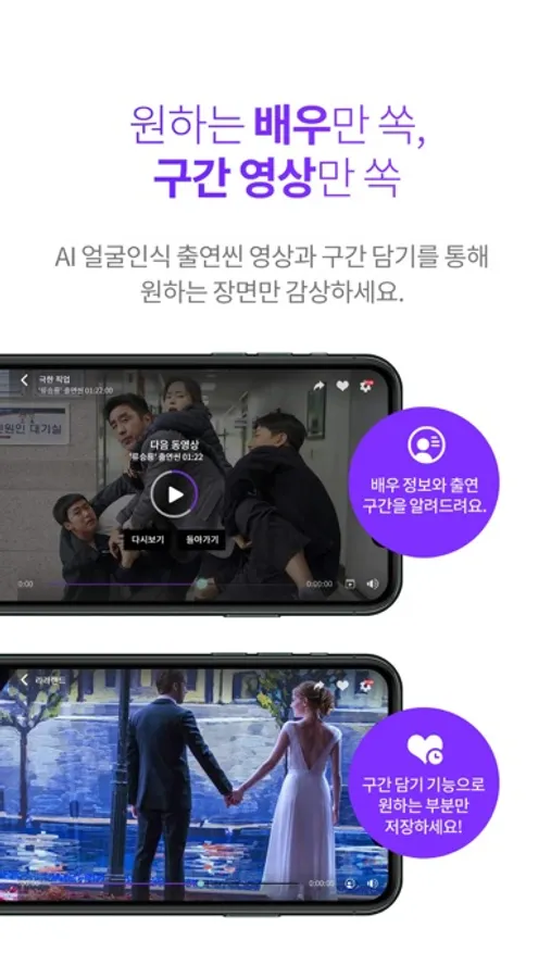 • AI 얼굴인식 기능을 통해 배우 출연씬 영상을 제공하고, 원하는 출연씬을 담아 이어보기할 수 있습니다.