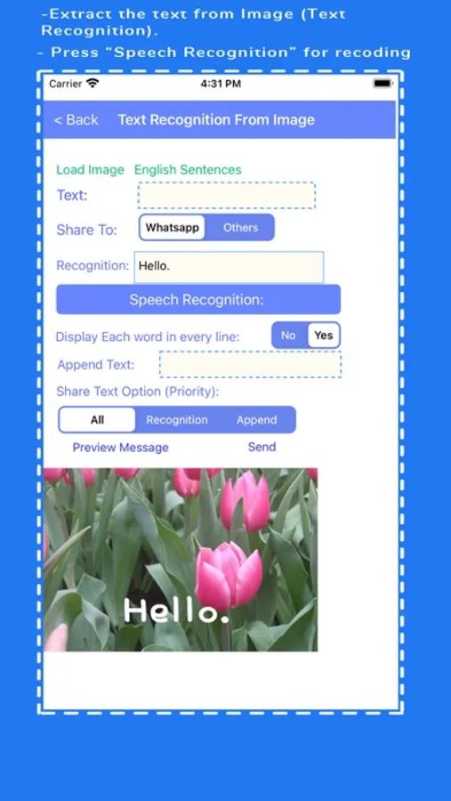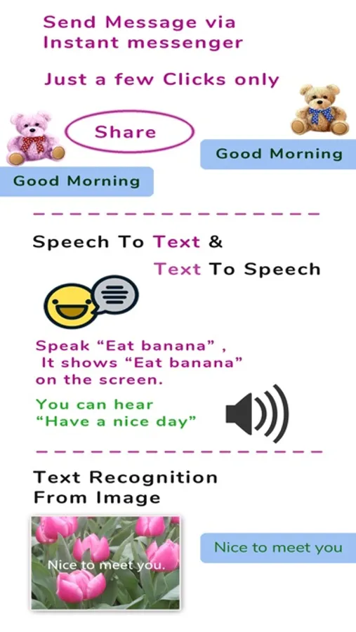 Apart from sending messages in English, you can also add the English sentence to the photo. And also Extract the text from image (text Recognition from image) and Speech Recognition are also supported. Furthermore, "Share Favorite Color(s) (Color Recognition)" function is added. Share the favorite to friends by recognizing the color in my favorite photo.