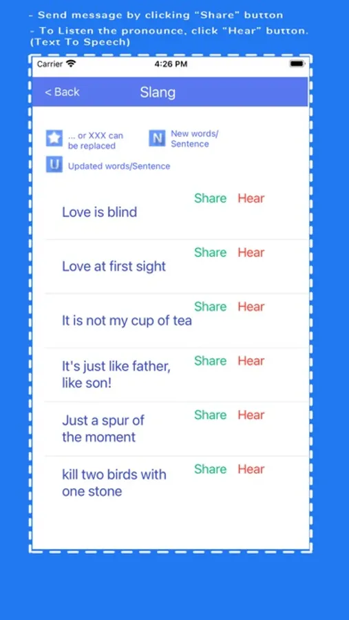 There are four categories which allow user to send messages in English such as basic sentences, greeting, slang and love.