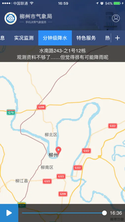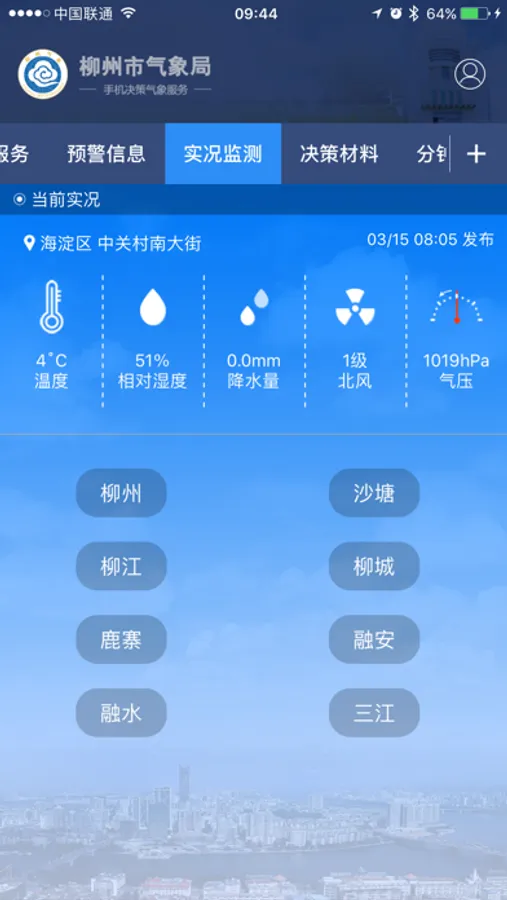 "柳州气象"是柳州市气象局官方手机决策服务客户端,客户端面向柳州市气象局和柳州市人民政府局委办领导、专业客户提供决策气象服务保障。“柳州气象”客户端不仅提供了权威的气象信息,还为决策、专业用户提供了图形化的电子信息地图组件服务,可以在电子地图上展现天气监测实况、预报预警服务等气象信息。直观地展现柳州及周边地区的具体天气实况和预报预警等信息,为政府、各级应急指挥人员以及行业部门决策提供了准确的地理位置、应急地点等信息,为与天气相关的防灾减灾工作提供可靠的保障。