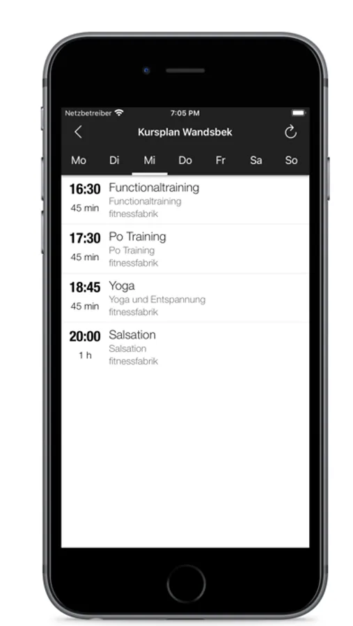 Direkter und aktueller Zugriff auf den Gruppentrainingsplan: Für jeden Kurs können Sie Details wie Zeit, Kursbeschreibung und leitender Trainer einsehen.