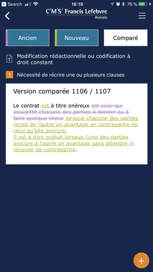 Avec Contralto, l’application de la réforme du droit des contrats, se veut intuitive, innovante et adaptée à vos besoins. Chaque évolution de texte est matérialisée par une icône spécifique permettant d’identifier l’importance du changement et les principaux impacts sur vos pratiques. La recherche est facilitée par un moteur de recherche.