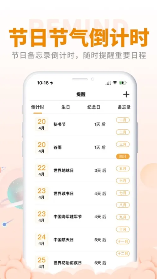 3.节日节气:各种节气、节日、假日安排,实时提醒;