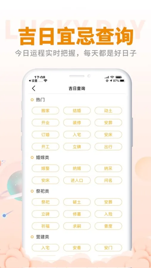 4.宜忌查询:搬家吉日,结婚吉日,开业吉日,安葬吉日等等;