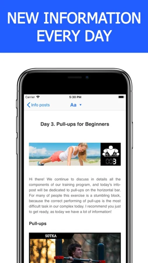 - Infoposts with answers to the most popular beginner's questions: how to breath, how to improve flexibility, how to train during summer/winter, how to learn pull-ups from scratch, how much water to drink, how long should training session be and etc.
