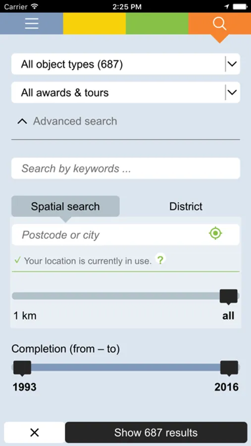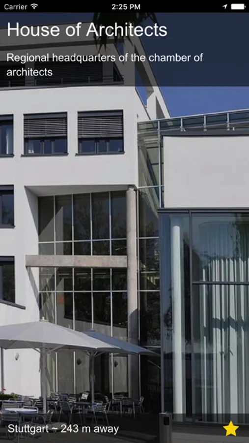 You can either view objects of interest that are near to you or filter them by criteria: You can search by location, district, award or their presence in an architectural guide produced by the architectural chambers. Any object can be marked as a favourite and thereby be directly accessed at any time during a planned tour, for example. An entire query can also be stored extremely easily.
