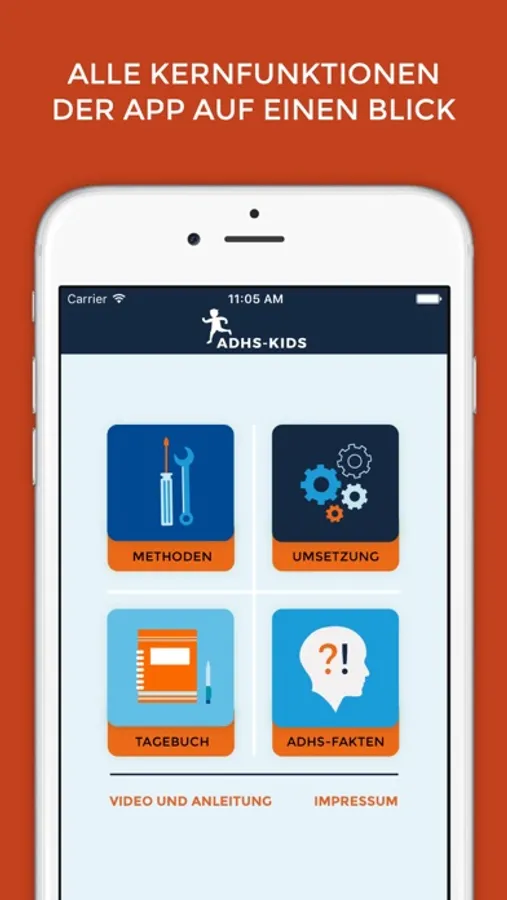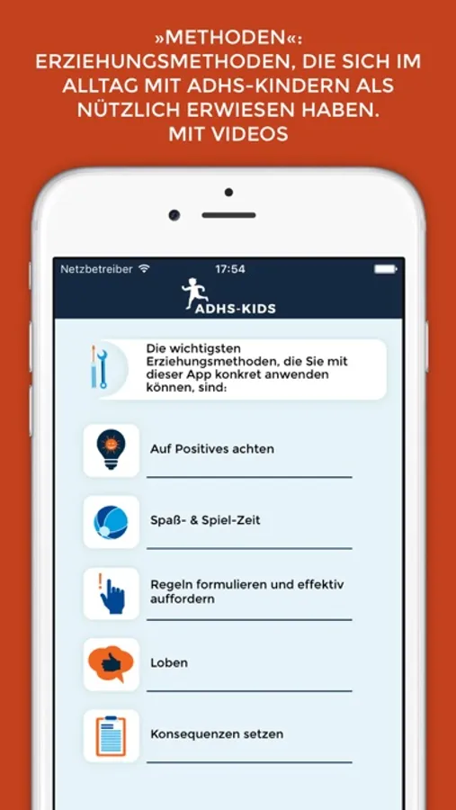 Im ersten Schritt lernen Sie über Videos, Texte und Merksätze konsequente Erziehungsmethoden kennen, um sich und damit Ihrem Kind zu helfen. Im nächsten Schritt geht es um die Umsetzung. Es werden die wiederkehrenden Probleme im Alltag mit dem hyperaktiven Kind beschrieben, die Sie bearbeiten können. Dann werden Erziehungsregeln mit positiven und negativen Konsequenzen definiert. Durch eine Erinnerungsfunktion können sie in das Familienleben integriert werden. Merksätze und Tipps dienen als Unterstützung im Alltag. Über ein Tagebuch werden die Fortschritte dokumentiert.