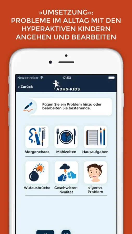 Im Bereich »Umsetzung« können Sie Probleme, die Sie im Familienalltag mit Ihrem Kind haben, angehen. Für 5 häufig auftretende Problemsituationen (Morgenchaos, Mahlzeiten, Hausaufgaben, Geschwisterrivalität und Wutausbrüche) werden sinnvolle Regeln und Konsequenzen vorgeschlagen. Die App bietet zusätzlich die Möglichkeit, individuelle Problemsituation aus dem eigenen Familienalltag aufzunehmen. Ist eine Problemsituation beschrieben, werden Sie Schritt für Schritt angeleitet, die Erziehungsmethoden umzusetzen. Über eine Erinnerungsfunktion, z.B. beim Frühstück, können Sie sich anzeigen lassen, wie Sie sich konsequent verhalten.