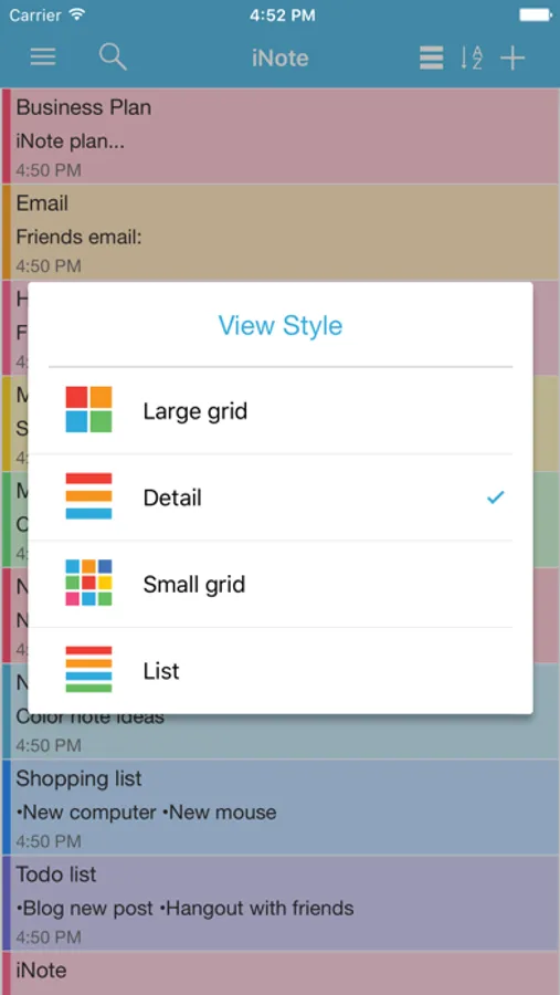 You can view your notes in grid (like sticky note), quick list, or detail list. This app helps you sort notes by color, remind time, updated time, created time, or title name. So you can view these note quickly and super easily.