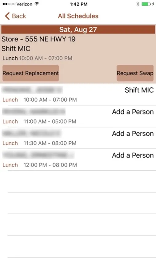 Be notified of posted schedules, shift changes and even request a replacement/swap with another employee.