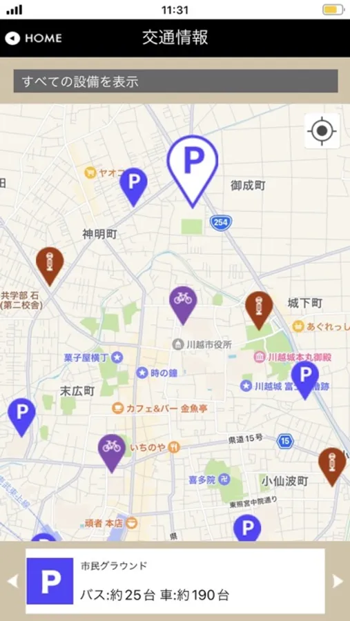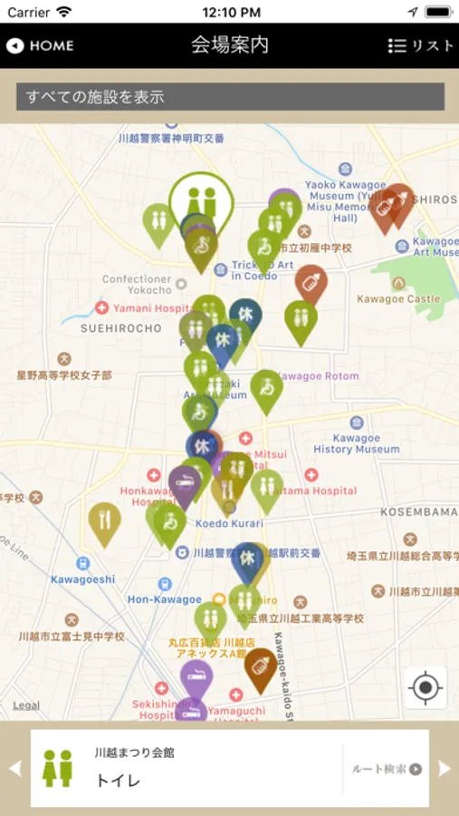 トイレや赤ちゃんの駅、屋台村といった川越まつりの各施設の位置を現在地とともに地図上に表示。場所の特定だけでなく、地図アプリを起動させてルート検索することもできます。