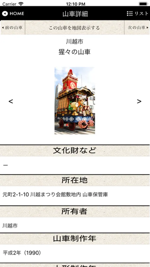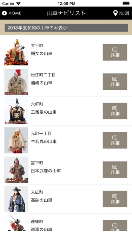 また、山車の一覧リストからお目当ての山車を選択すれば、その山車をピックアップして表示します。