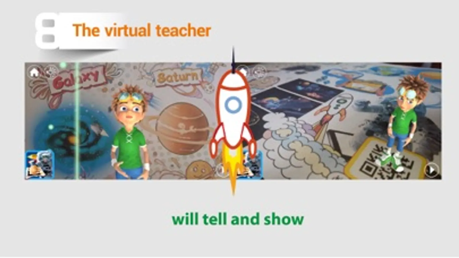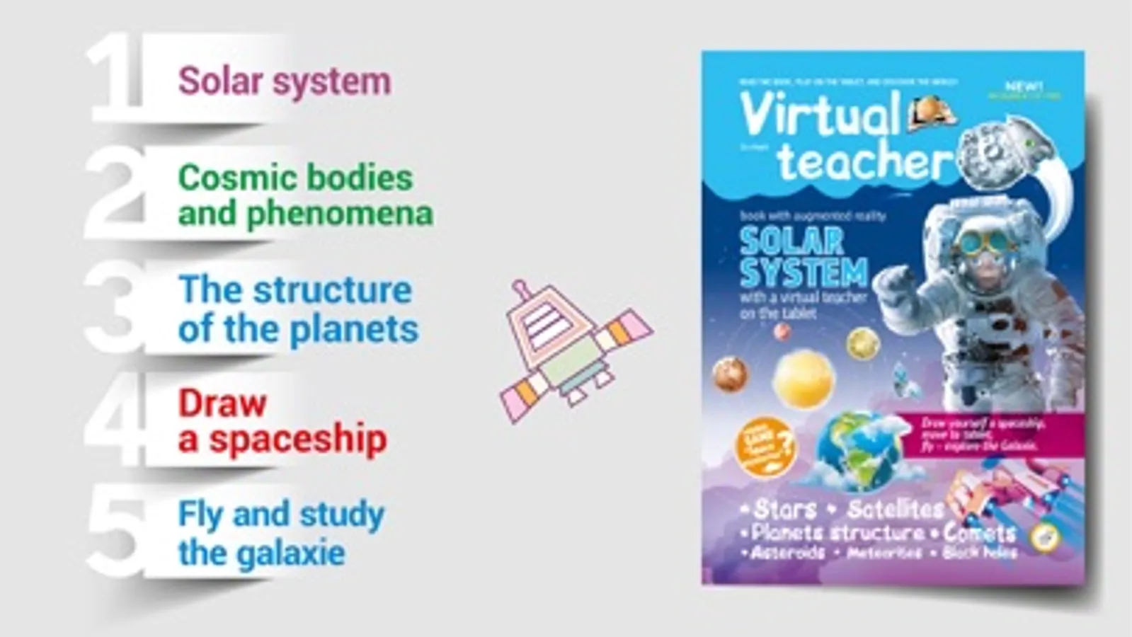 Planets of the solar system with the augmented reality. The program for child’s development: "Books with a virtual teacher - children's astrology." Print the pages of the book “Astrology for Children” with tasks, and together with your child immerse the in an exciting game! Discover the structure of the solar system in the real and virtual worlds at the same time. In the real world, a child can perform logical tasks where there is a solar system. He can choose and color a spacecraft and also discover the planets and basics of astrology. Just point your tablet at the page of the book, and the virtual teacher Danik is activated.He will tell you interesting stories, help to transfer a colored spacecraft to your tablet and show you the Solar System 3D. Your child will go on a trip to find the crystals of knowledge in the solar system and to learning astrology.