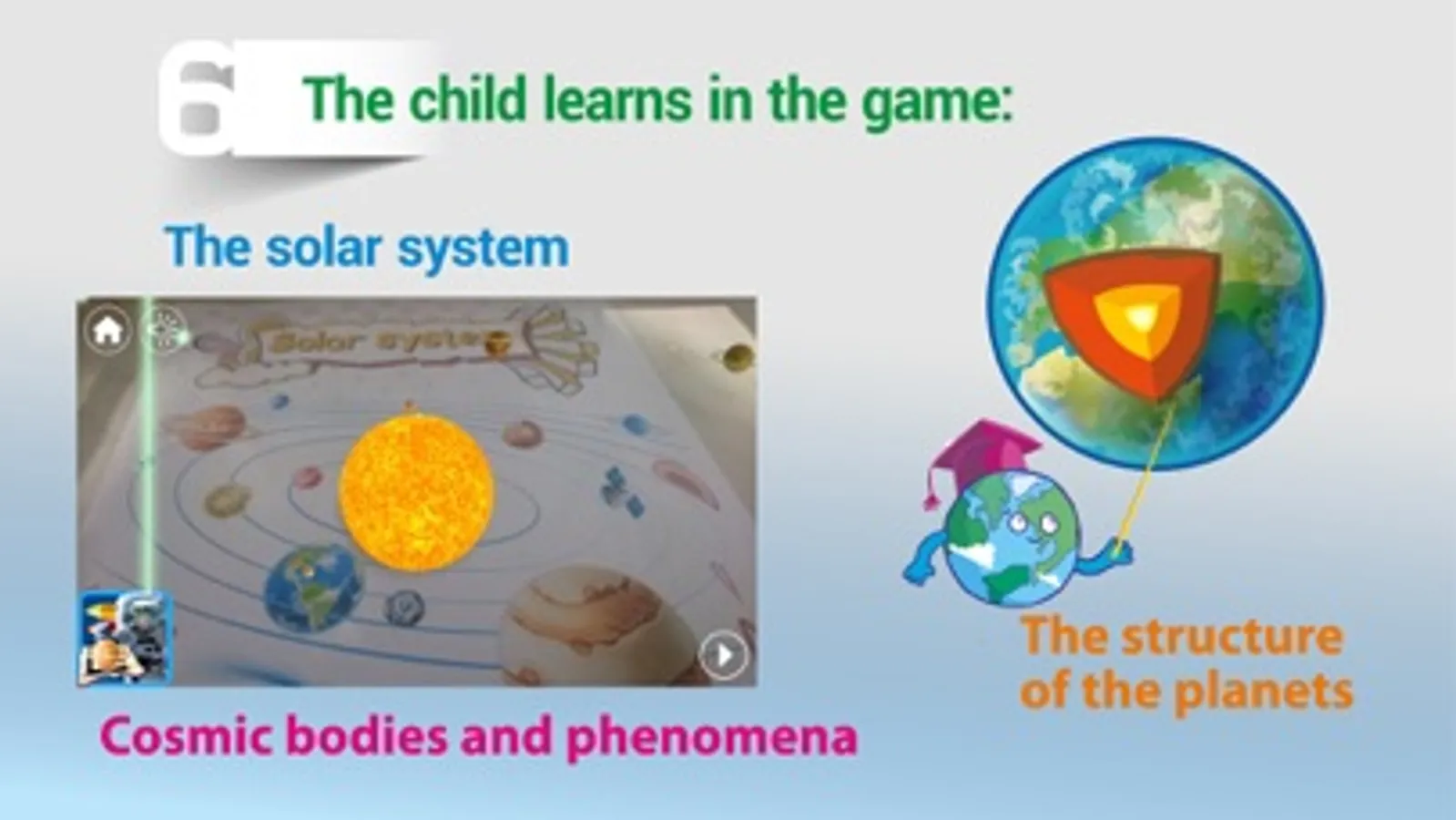 - Game location "Secrets of the cosmos": while traveling in a virtual world, the child is learning the structure of the solar system.