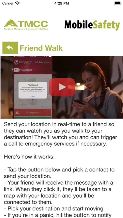 - Friend Walk: Send your location to a friend through email or SMS on your device. Once the friend accepts the Friend Walk request, the user picks their destination and their friend tracks their location in real time; they can keep an eye on them to make sure they make it safely to their destination.