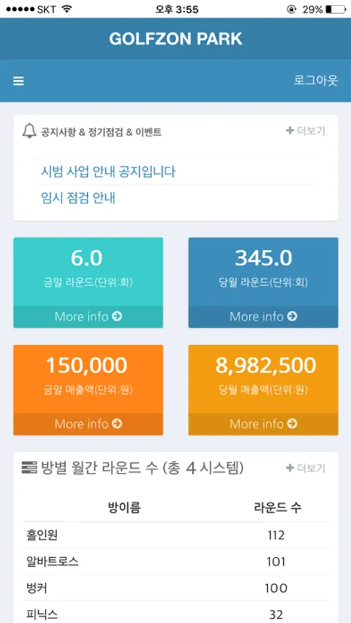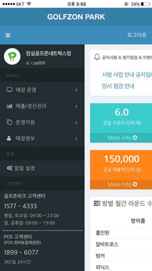 공지, 정기점검 안내 글과 매장의 라운드 수, 매출액을 확인하실 수 있습니다.