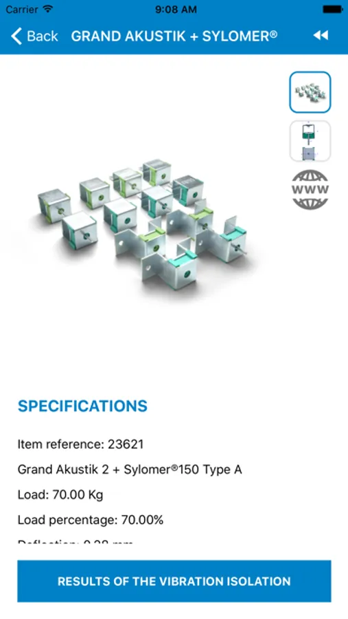 This app allows you select the acoustic hanger according to the degree of isolation or cost effectiveness.