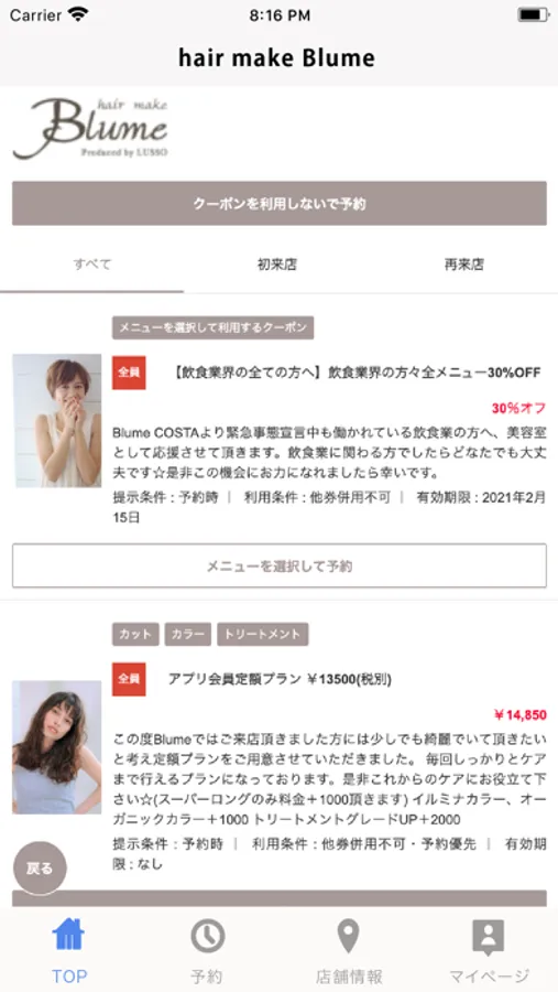 お得なクーポンが配信されます。ネット予約時にクーポン利用での予約も可能なので来店時もスムーズに施術頂けます。