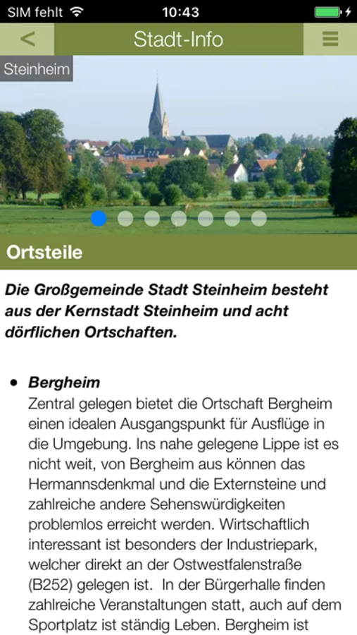 Mit der offiziellen Steinheim-App erhalten Sie ausführliche Informationen über die Stadt, einen übersichtlichen Rathaus-Wegweiser, nützliche Hinweise zu Sehenswürdigkeiten, interessante Kultur-, Freizeit- und Sportangebote, ein regionales Branchenbuch und ein umfangreiches Ärzteverzeichnis sowie aktuelle Nachrichten und Veranstaltungshinweise. Ob Sie die App als Bürger, Neubürger, Gast oder als Unternehmer bzw. Freiberufler nutzen - Sie sind stets auf dem Laufenden.