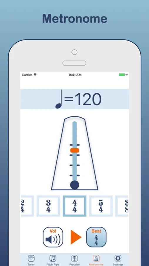 Metronome: set tempo using slider or tapping on the screen. Choose between traditional swinging metronome display or flashing metronome