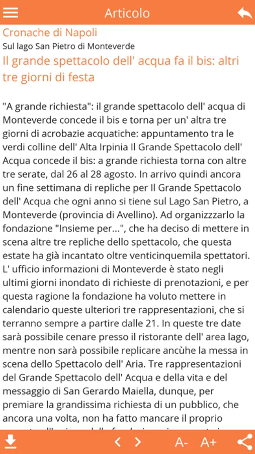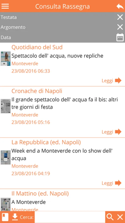 App rassegne stampa. L'app permette, previa registrazione, di avere accesso ad articoli di giornali, riviste, settimanali, etc. che risultano di interesse per l'utente. Gli articoli sono scaricati sul dispositivo e possono esssere consultati anche offline. E' possibile condividere testo e link dell'articolo tramite Whatsapp.