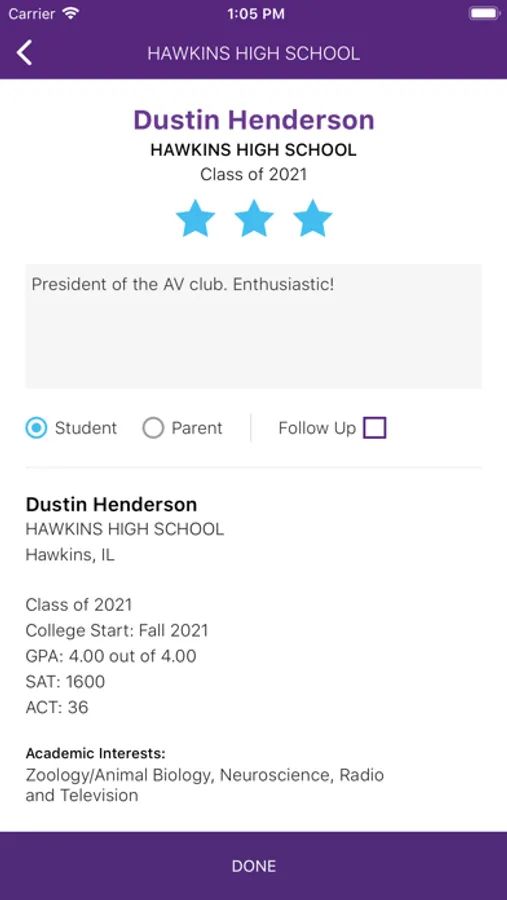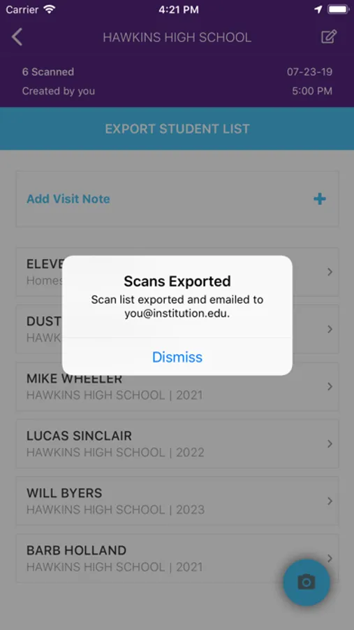 - 24 hours after a Fair or Visit, students are emailed a report with contact information for every institution and rep that scanned them.
