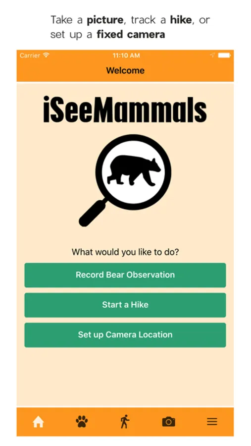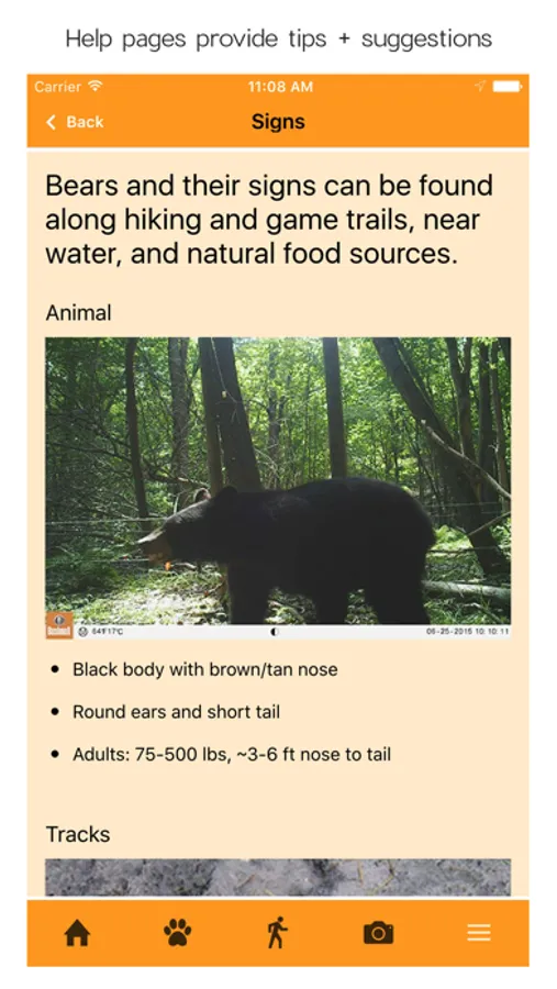 Help researchers study black bears with iSeeMammals! Use the app to 1) take photos of bears and their sign (tracks, scat, hair, and markings), 2) track a hike, and 3) set up and monitor fixed/trail cameras. Your contributions will inform bear management in New York. Help pages offer identification tips and suggestions for collecting and submitting quality data.