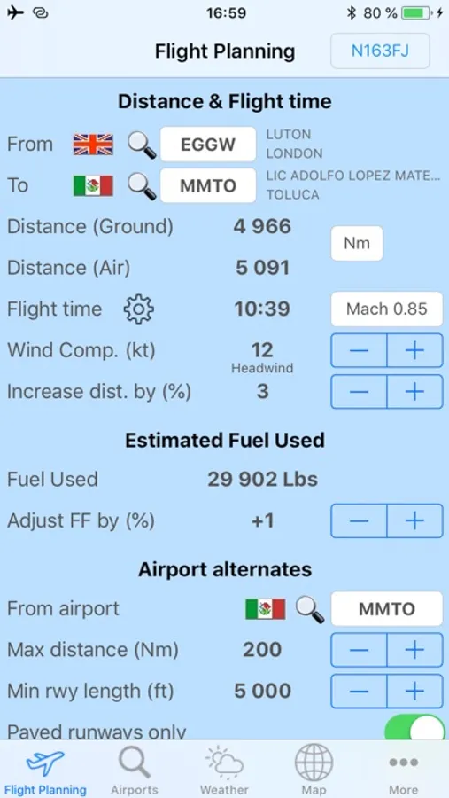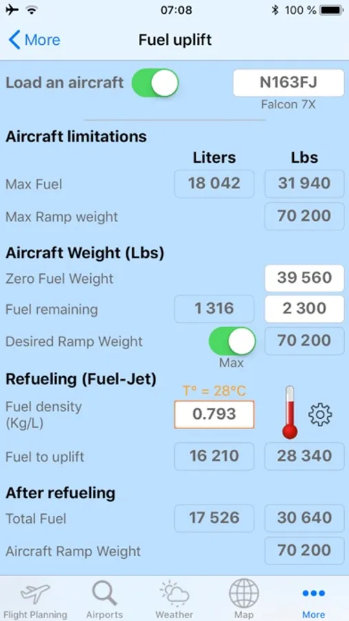 Just enter desired uplift fuel volume, fuel weight or your desired aircraft ramp weight and Flight Ops will compute other numbers at once!