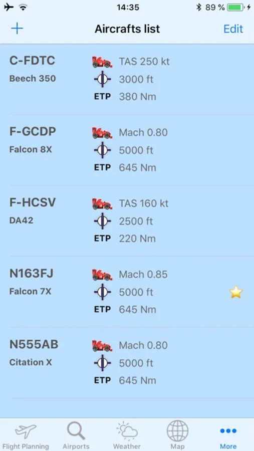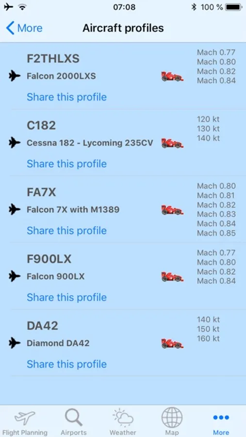 You can easily create and manage your aircraft profiles, setting the following: