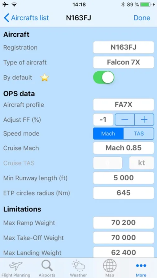 If you fly different birds, your aircrafts limitations can be stored in the database.