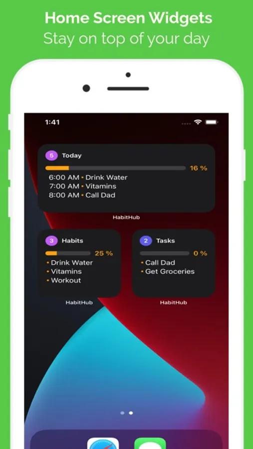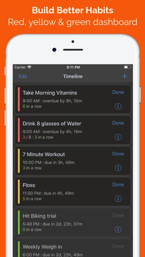 o FOCUS with today widget with next habit on top based on current time with all habits chronologically lined up with the habit running late to not due sorted in order. Leverage Siri Shortcut phrases to complete habits saving time.