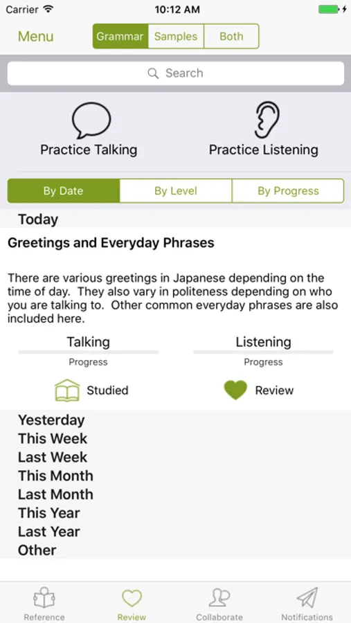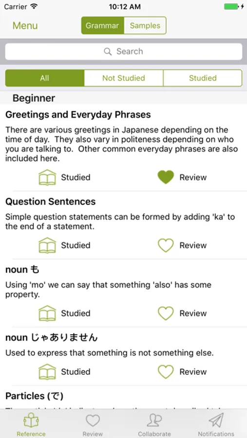 Gram-ma has 3 modes of operation. Reference, where you can search for grammar and sample sentences and tag them for review or mark them as studied. Review, where you can practice your tagged grammar and samples using voice recognition. Collaborate, where you can create your own grammar explanations and sample sentences and link them together; you can also discuss and help correct other contributor's content.