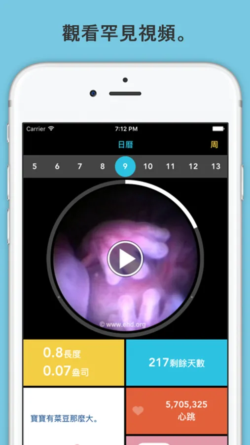 作為一位准媽媽,看到末次月經後6½周時慢鏡頭呈現的胎兒跳動的心臟一定會讓您驚喜萬分。您還將看到胎兒在子宮內的頭、下巴、手和腳、正在發育的大腦和肝臟、新生手指和腳趾以及胎盤與臍帶!