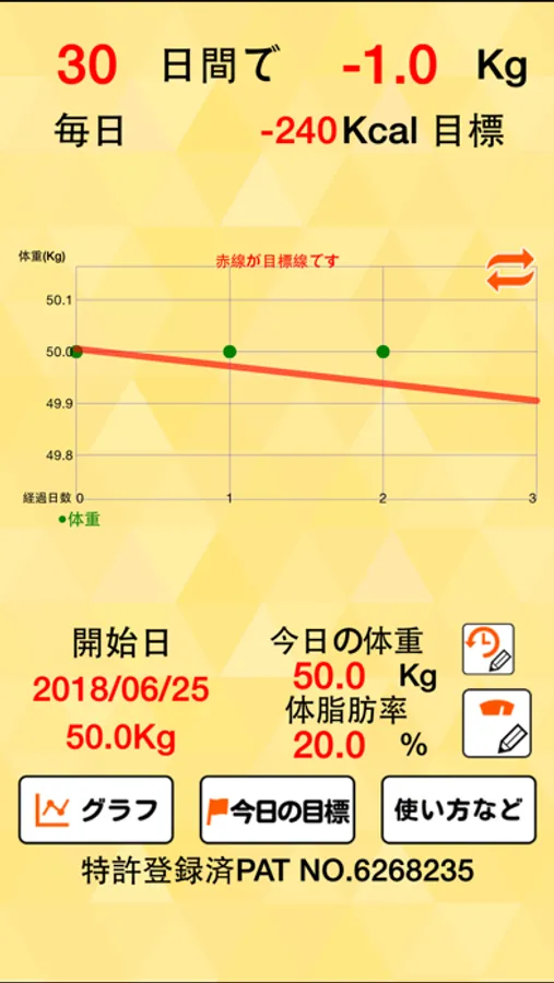 赤い目標線と体重グラフを自動生成します。やせたい人や体重増加管理の妊婦さんなどにお勧め。糖尿病専門医が開発し、特許登録済PAT No.6268235。