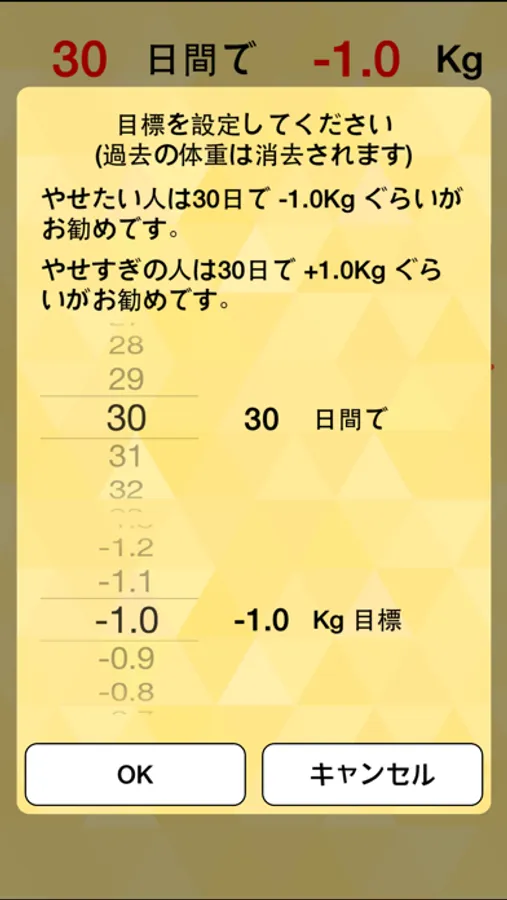 目標をリセットすると、過去の体重データは消去されます。大事な記録はご自分でメモしておいてください。