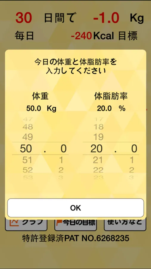 "Congratulations!!"と出たら、今日は無理せず体重維持で十分です。