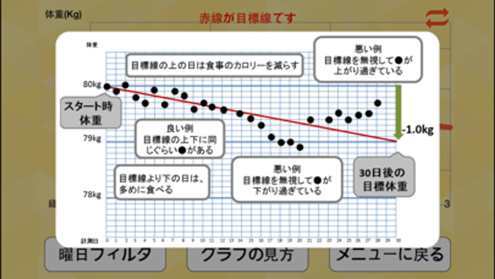 土曜日の体重だけグラフ表示して、土曜日だけ目標線より体重が重かったら、花の金曜日の食べ過ぎが原因かもしれません。