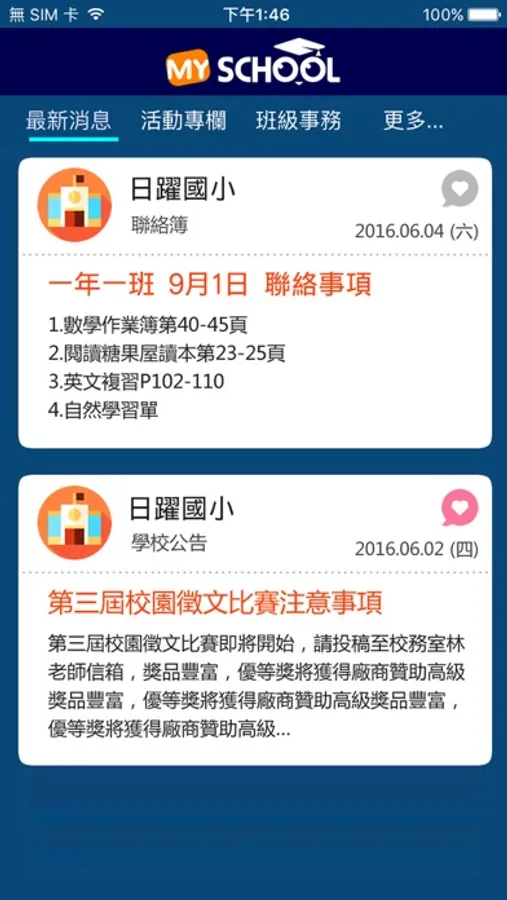 我們致力於開發讓學校老師與家長間資訊流通的產品,透過MY SCHOOL,老師可線上(APP/網站)發布聯絡簿內容,達到資訊E化,慢慢讓紙本聯絡簿轉化成電子聯絡簿。而家長可以透過APP即時收到當天的聯絡簿內容、學校網站的即時動態,並且可以瞭解孩子的午餐菜色,一起為孩子的營養把關。一起加入MY SCHOOL,讓您更貼近孩子的校園生活。