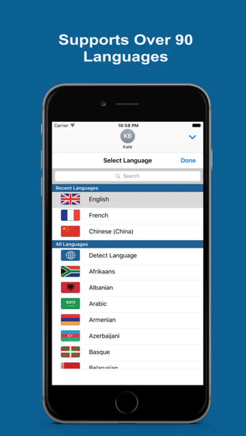 Afrikaans,Albanian, Arabic, Armenian, Azerbaijani, Basque, Bengali, Belarusian, Bosnian, Bulgarian, Burmese, Catalan, Cebuano, Chinese(China), Chinese(Taiwan), Croatian, Czech, Danish, Dutch,English, Esperanto, Estonian, Filipino, Finnish, French, Galician, Georgian, German, Greek, Gujarati, Haitian, Hausa, Hebrew, Hindi, Hmong, Hungarian, Icelandic, Igbo,Indonesian, Irish, Italian, Japanese, Javanese, Kannada, Kazakh, Khmer, Korean, Lao, Latin, Latvian, Lithuanian, Macedonian, Malagasy, Malay, Malayalam, Maltese, Maori, Marathi, Mongolian,Nepali, Norwegian,Nyanja, Persian, Polish, Portuguese (Brazil), Portuguese(Protugal), Punjabi, Romanian, Russian, Serbian, Sinhala, Slovak, Slovenian, Somali, Southern Sotho, Spanish, Sundanese, Swahili, Swedish, Tajik, Tamil, Telugu, Thai,Turkish, Ukrainian, Urdu, Uzbek, Vietnamese, Welsh, Yiddish, Yoruba, Zulu