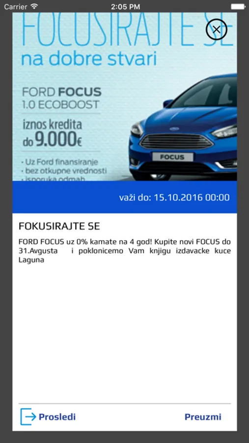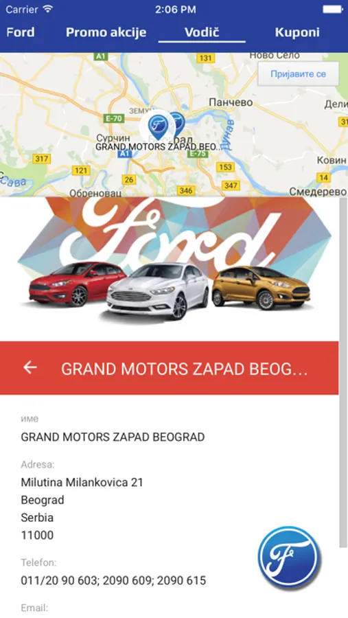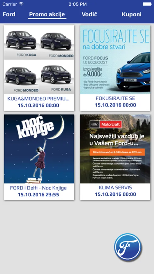 + Ne propustite Ford promo akcije. Ovde možete videti i ako želite poručiti kupone koji Vam mogu doneti specijalne popuste na servisne usluge ili na kupovinu novog automobila, auto aksesoara i slično.