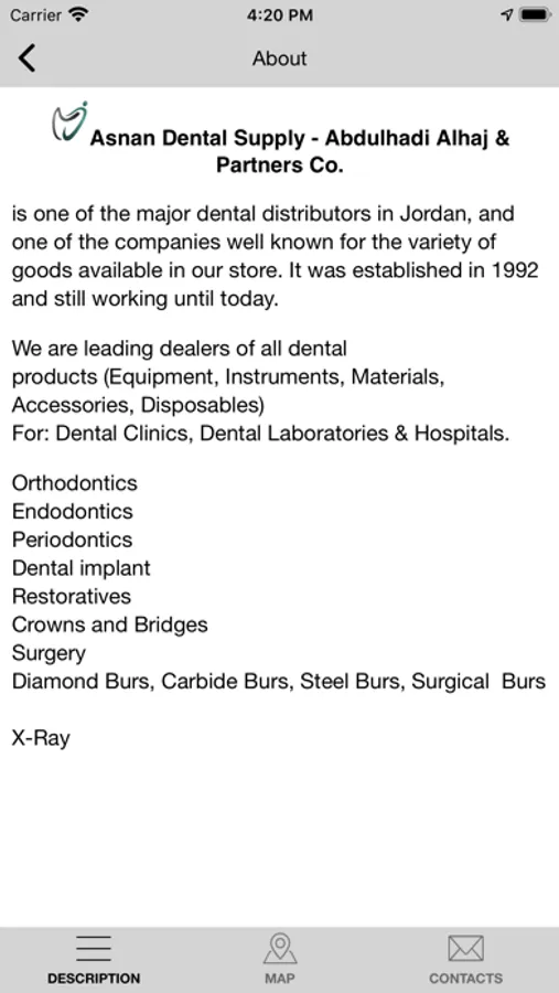Asnan Dental Supply - Abdulhadi Alhaj & Partners Co.is one of the major dental distributors in Jordan, and one of the companies well known for the variety of goods available in our store. It was established in 1992 and still working until today.