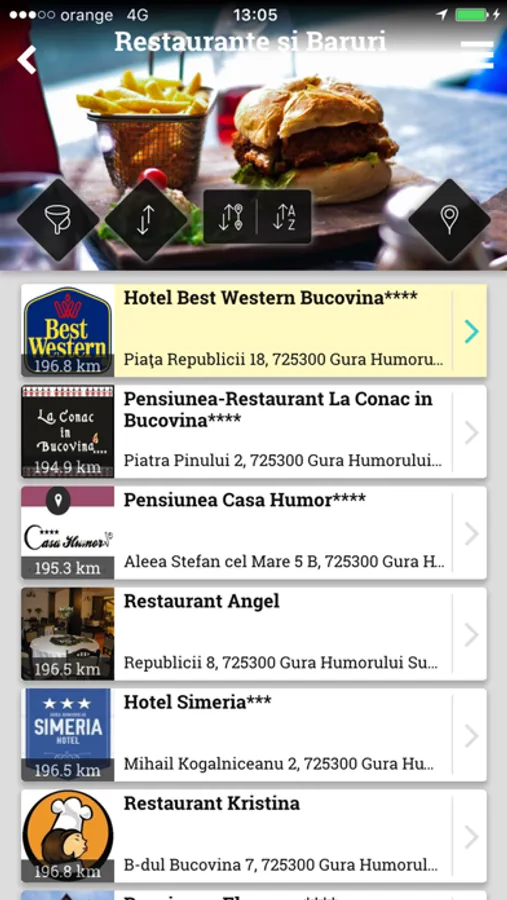 Toate elementele pot fi sortate alfabetic sau dupa distanta. De asemenea, se pot folosi optiuni de filtrare, in functie de tipul de punct de interes.