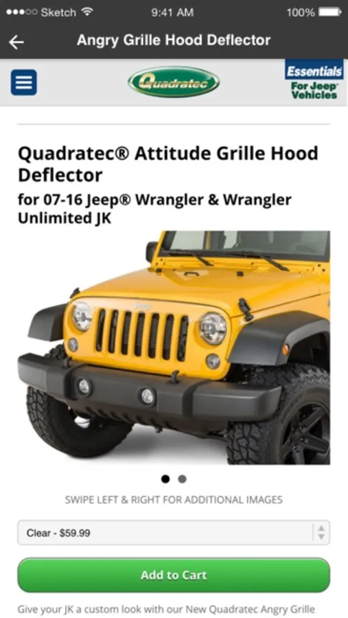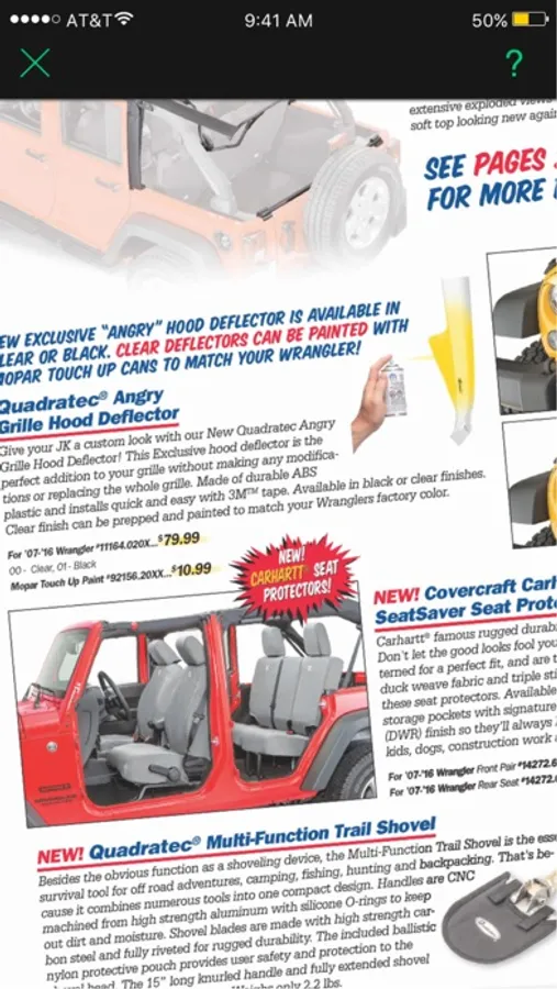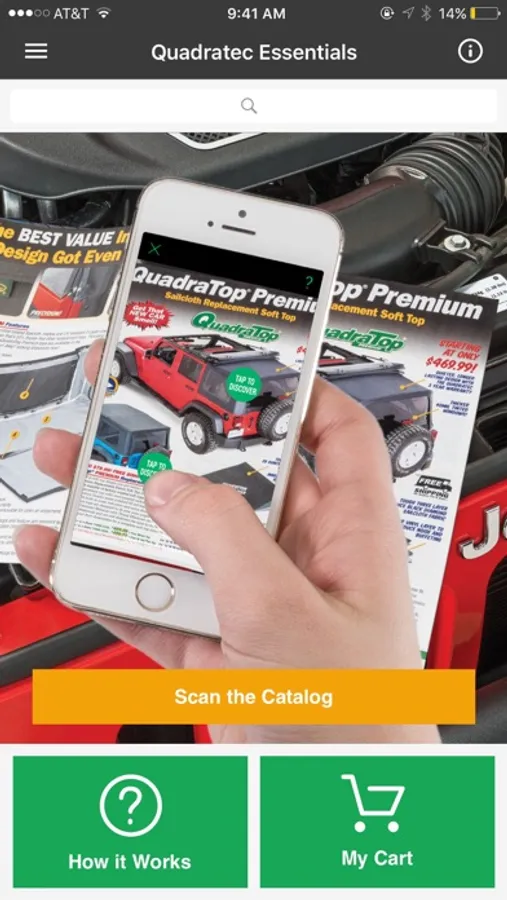 The Quadratec Catalog App takes the Quadratec Essentials Catalog to the next level. Just browse your Quadratec catalog as you normally would. When you see something that interests you, open the app and find the part using the code in the catalog. You will instantly be taken to that product to see additional photos, instructions, videos, special offers and more. Plus, if you're ready to buy, just add the item to your cart and go!