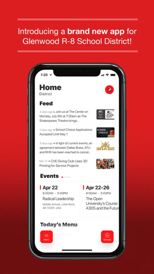 The event section shows a list of events throughout the district. Users can add an event to your calendar to share the event with friends and family with one tap.
