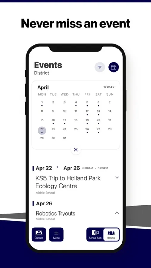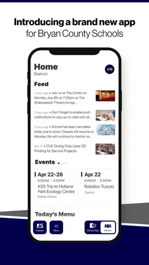 The event section shows a list of events throughout the district. Users can add an event to their calendar to share the event with friends and family with one tap.
